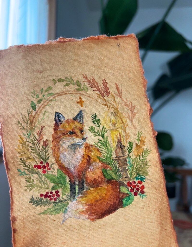クリスマスの雰囲気を感じさせる、キツネが描かれた水彩画の原画です。サイズは10×15センチの羊皮紙で、どんな場所にも飾りやすいコンパクトさが魅力です。キラキラとした仕上がりが、特別な空間を演出します。
